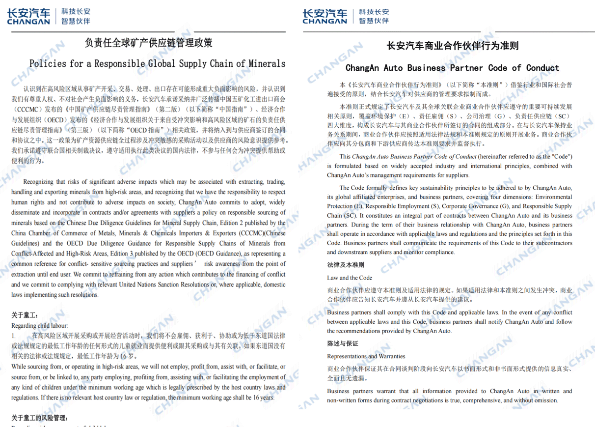 面对欧盟《电池与废电池法规》、《企业可持续发展尽职调查指令》等对动力电池碳足迹、关键矿产溯源及劳工权益等方面的严格要求,长安汽车视其为提升供应链国际竞争力的重要契机。公司通过组织20场专项研讨与培训,联动时代长安、中创新航、大陆等30家核心合作伙伴,共同推进可持续战略落地,系统性管理钴、镍、锂、天然石墨等关键矿产在开采加工中的环境与社会风险,坚决杜绝冲突矿产及劳工权益侵害。